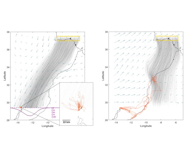 In this study we use data from a decade (2007-2017) of field monitoring and integrate different data and methods to reconstruct how the food availability for Eleonora’s falcons (small migratory birds) is regulated by trade winds. Falcons’ movements were studied with small GPS that allow us to know how far the falcons travel to hunt. The flow of migratory birds could be determined from the information collected by a meteorological radar located in the south of Portugal. The signals of these radars, designed for meteorological prediction are altered by the high number of birds that move south and in this way, we were able to estimate the flux of birds that depart from the southwest of the Iberian Peninsula to Africa, and model its flight paths from the prevailing winds experienced en route.